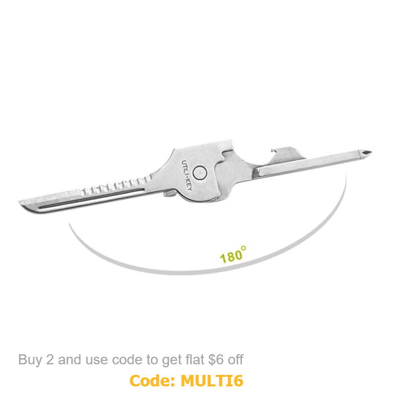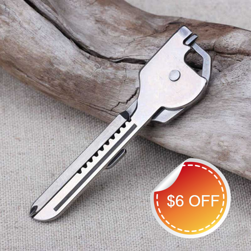 6-in-1 TOOLS Include Crosshead and flathead screwdrivers, bottle opener, knife, rope cutter, with key hole design to carry anywhere.